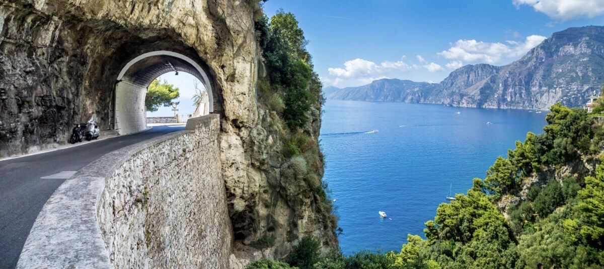 The legendary Amalfi Coast road hugs the cliffs like it was carved by artists instead of engineers. Every turn reveals something more breathtaking than the last—turquoise water stretching endlessly, pastel villages cascading down the hillsides, sunlight dancing off the sea.
